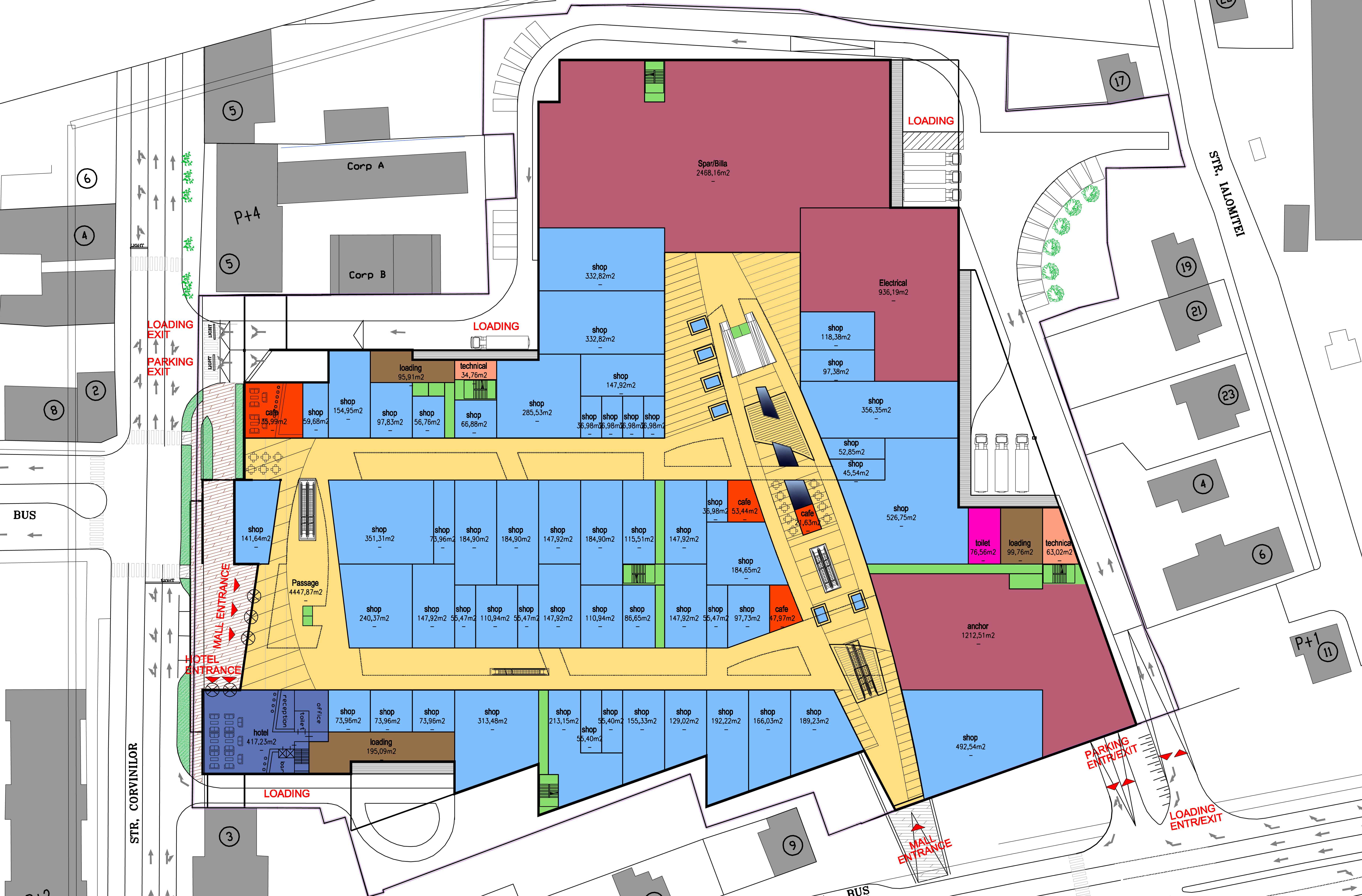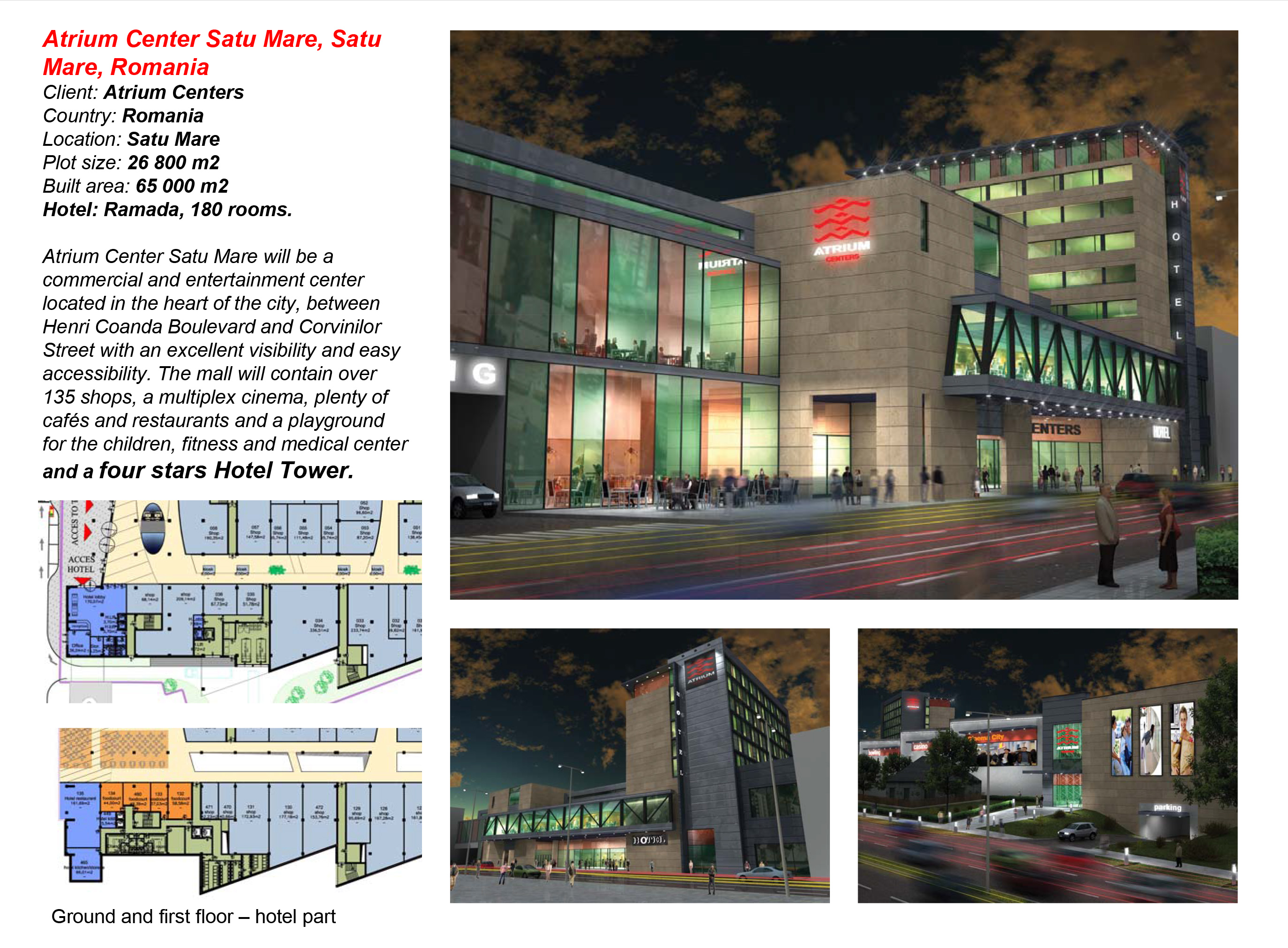 Atrium Center Satu Mare will be a commercial and entertainment center located in the heart of the city, between Henri Coanda Boulevard and Corvinilor Street with an excellent visibility and easy accessibility. The mall will contain over 135 shops, a multiplex cinema, plenty of cafés and restaurants and a playground for the children, fitness and medical center and a four stars Hotel Tower.