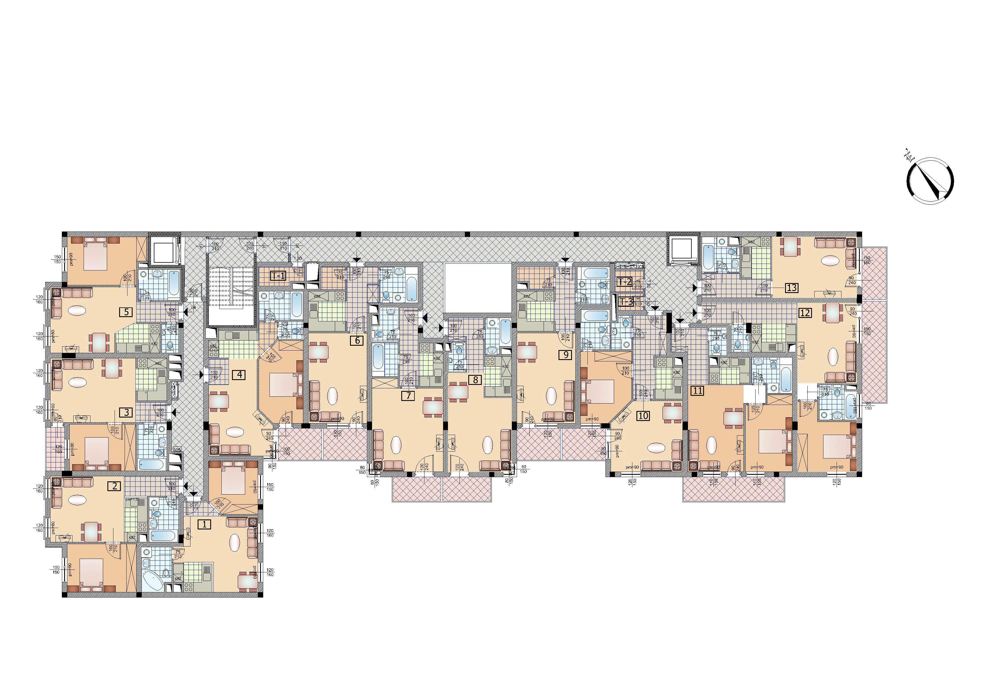 In the site, as per the built prescription with suitable forming, a close line building of 63 flats was built, with a basementfloor and with garage on the groundfloor.
