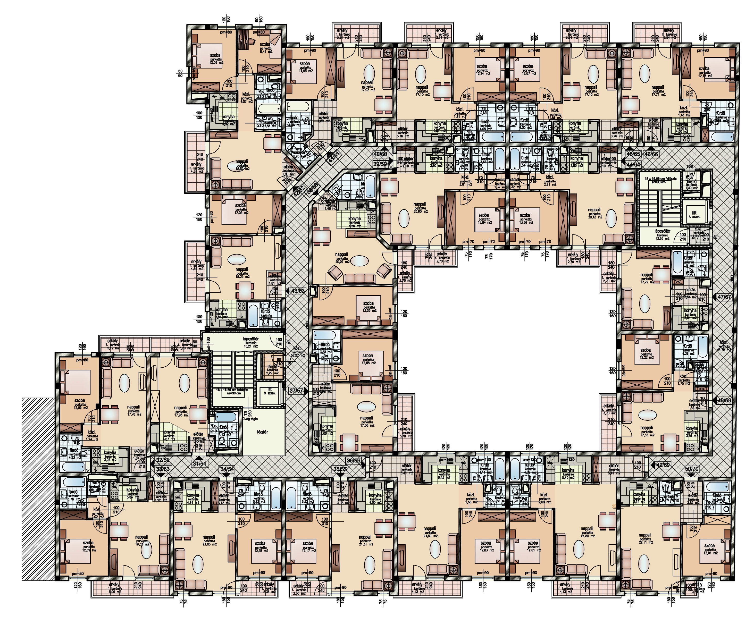 On the plot as per the built regulations with suitable forming planned a residential building of 43 flats, with hall garage in the groundfloor.