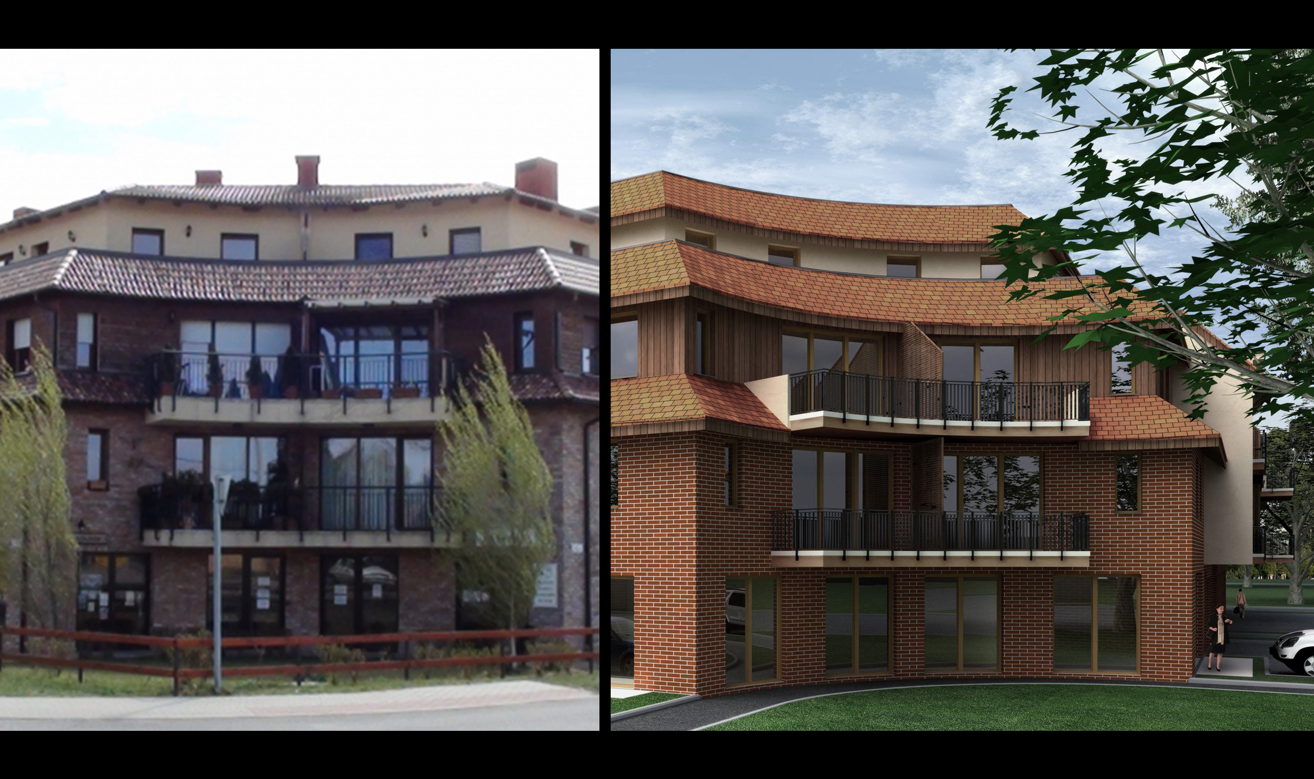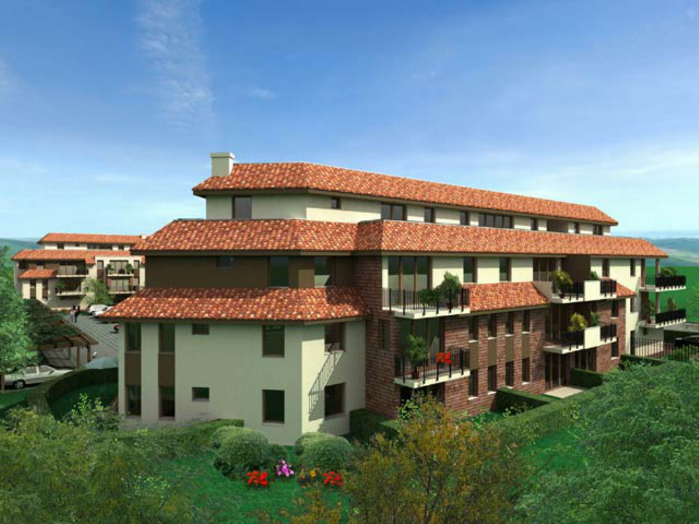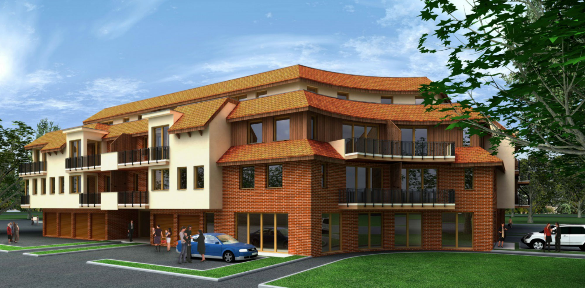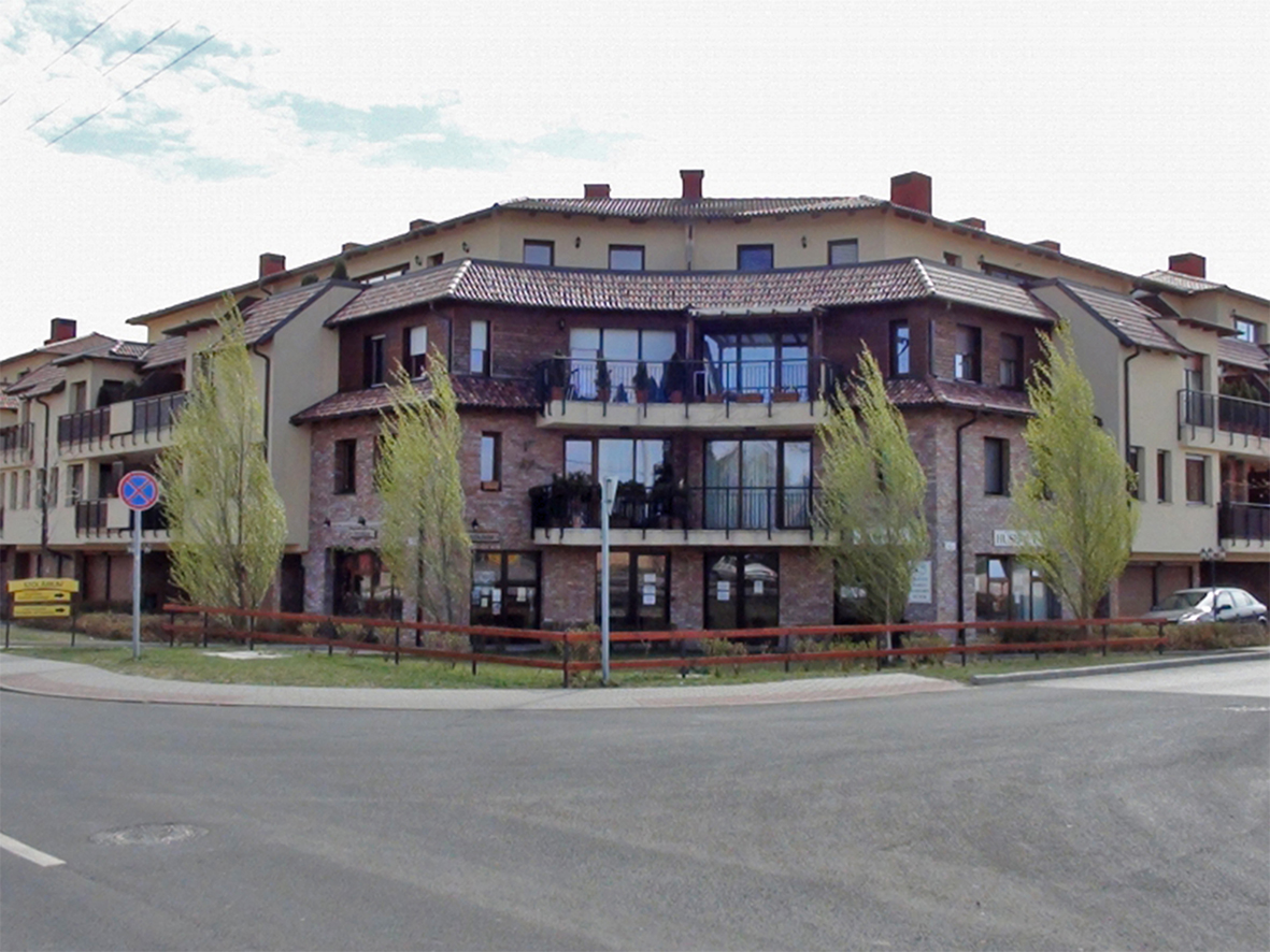 We designed two buildings with 70 apartments all together. Behind the buildings we created open parking places partly with wooden pergolas, and private gardens with small hill to separate the parking area from the flats. The building has no underground parking but 3 levels all together and ground floor. We created shops in the corner building in the ground floor. We used light yellow plaster, brick and dark brown wooden covering and Mediterranean style tiles on the roof. We created big penthouse and duplex apartments on the top floor with big balconies on the street and the garden side as well.