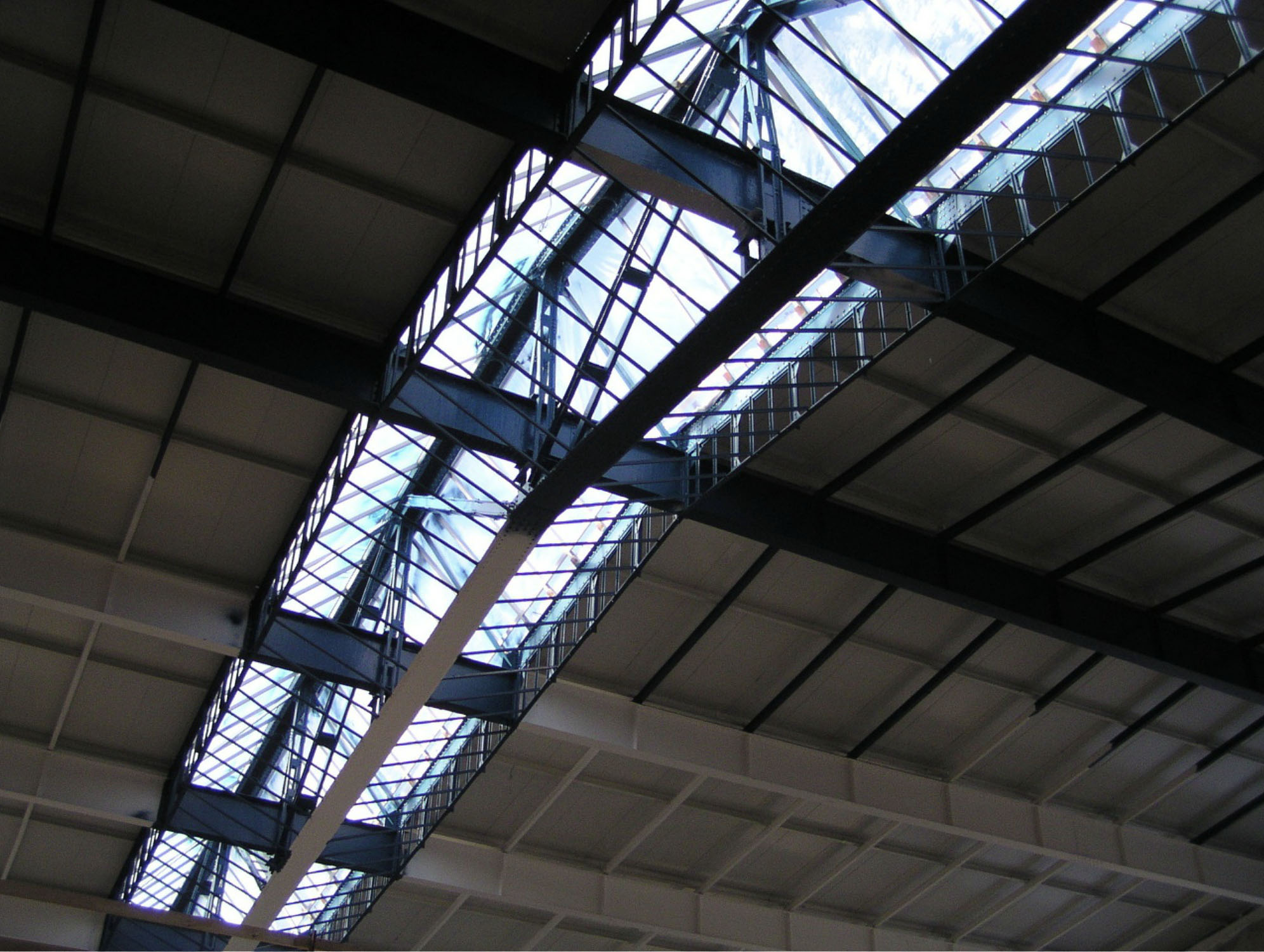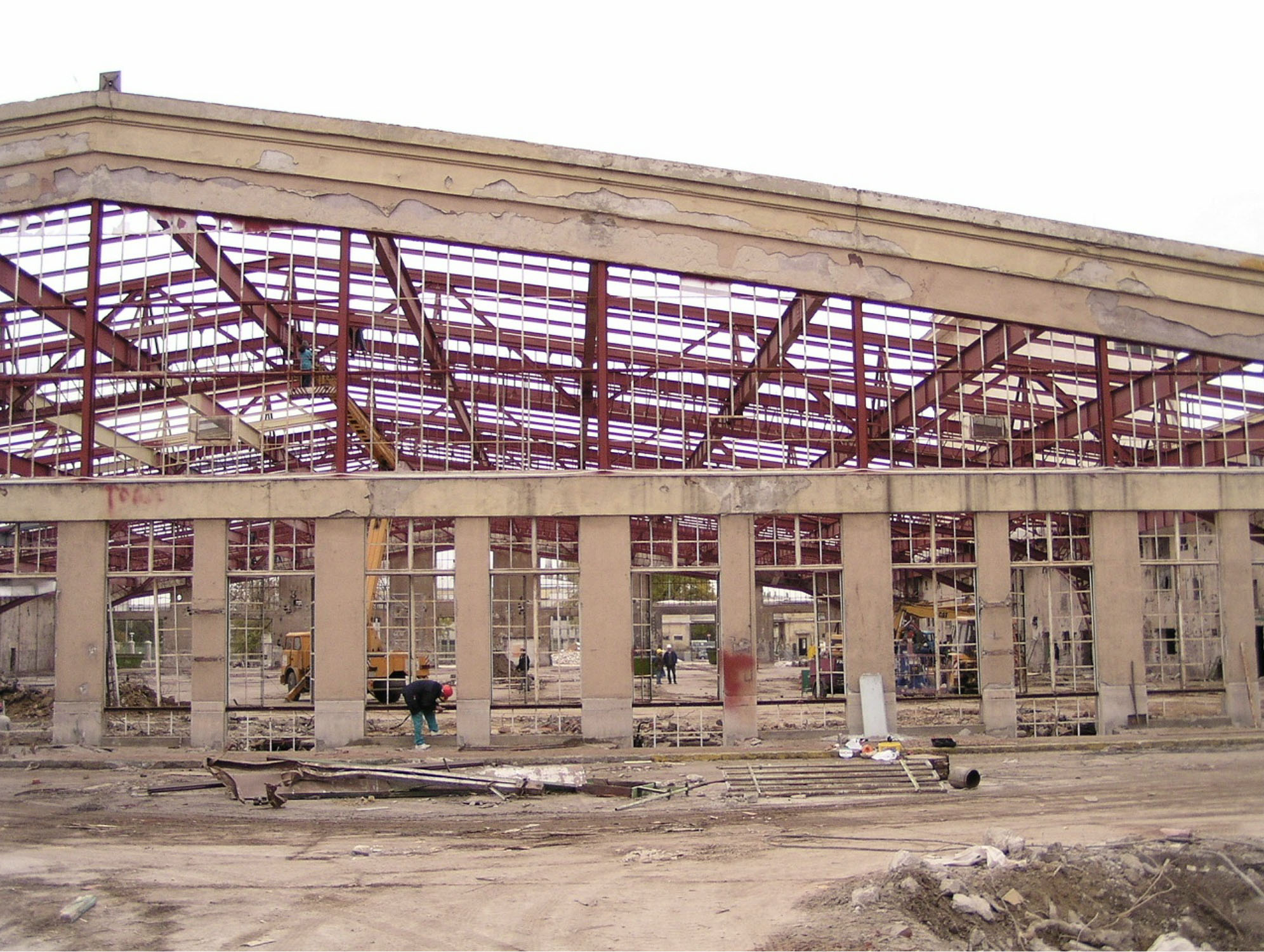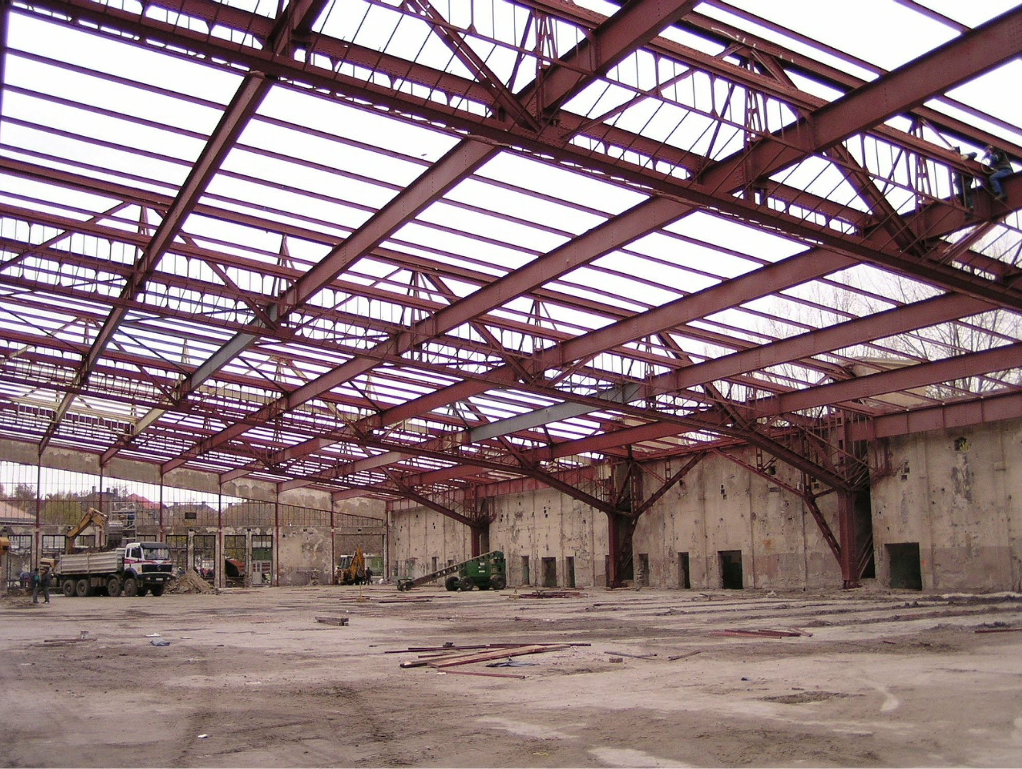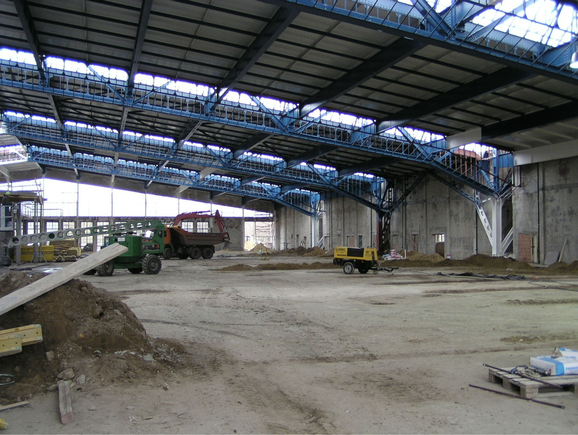 The building was originally an industrial historical monument built from bricks and glass elements. The former bus garage was refurbished and converted into a shopping center. The 60 m wide glass ceiling was kept and reconstructed providing natural light to the interior shopping area.