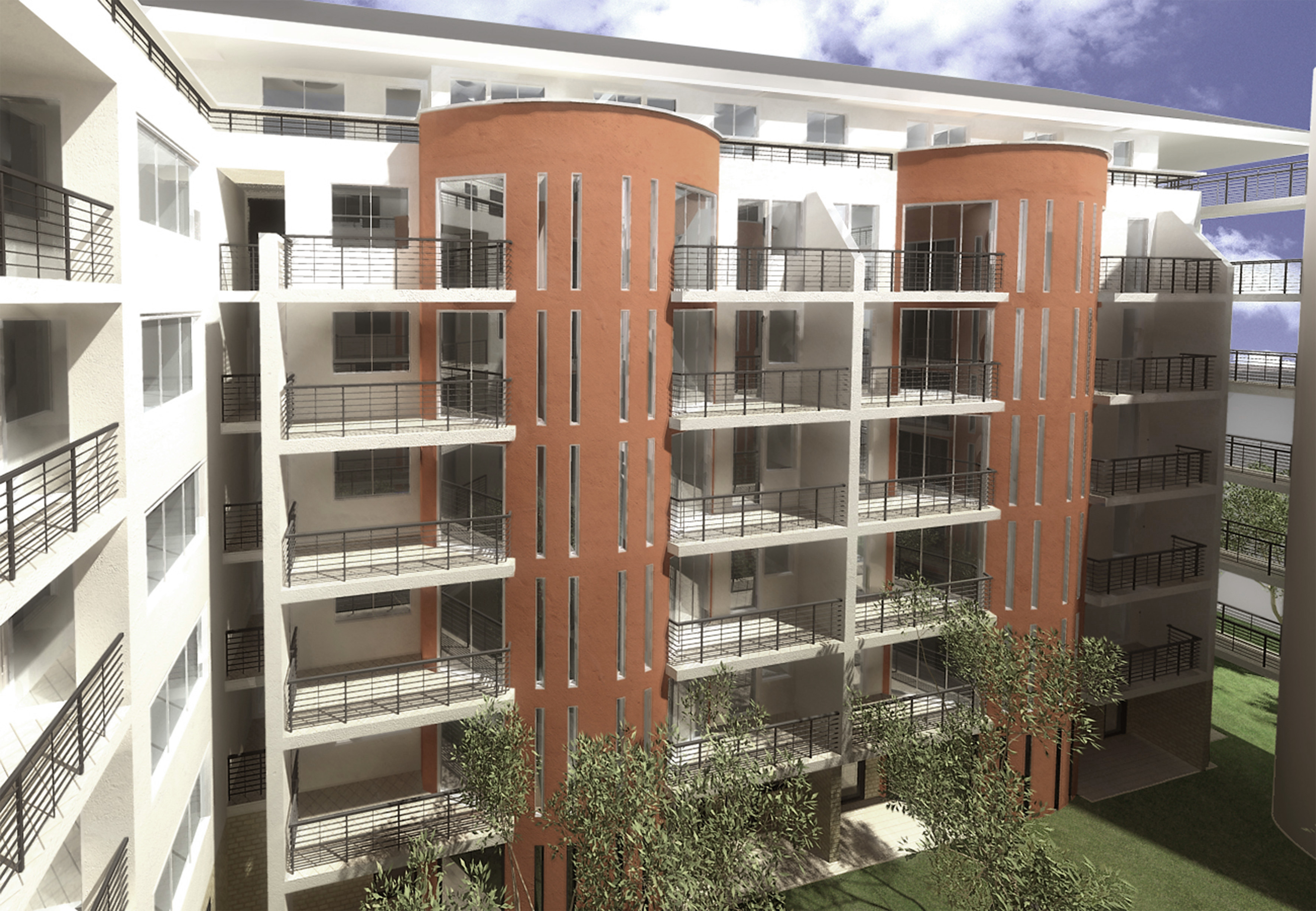 In the site, as per the built prescription with suitable forming, a close line building of 63 flats was built, with a basementfloor and with garage on the groundfloor.